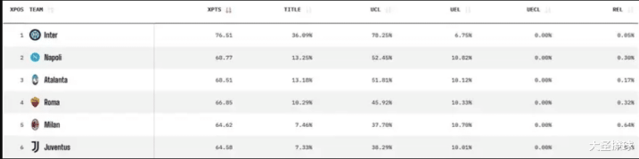但Opta预测这一次国米将会重新夺回意甲冠军,那不勒斯则无缘卫冕。与此同时,罗马将会获得第4名,亚特兰大将会排名第3位。新赛季无缘欧战的AC米兰将会位列第5名,获得欧联杯资格。尤文图斯排名第6,获得欧会杯资格。两支升班马比萨和克雷莫内塞以及莱切将会遭遇降级。